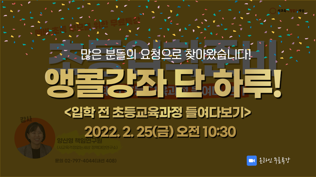 지난 1/25(화) 강의 이후 앵콜 요청이 많아, 예비 초등생 자녀를 두신 학부모님들을 위한 ‘초등학교에서는 뭘 배우나요?’ 강의를 한번 더 개최합니다. 1월 강의를 놓치신 분들과 저녁시간 수강이 어려우셨던 분들을 위해 2월 25일(금) 오전 10시 30분에 진행합니다. 예비 초등생, 내 아이가 만나게 될 첫 학교를 자세히 알려드리는 최고의 강의입니다. 무료로 수강하실 수 있는 마지막 기회 놓치지 마시고, 주변에 추천해서 같이 들어보세요. ^^