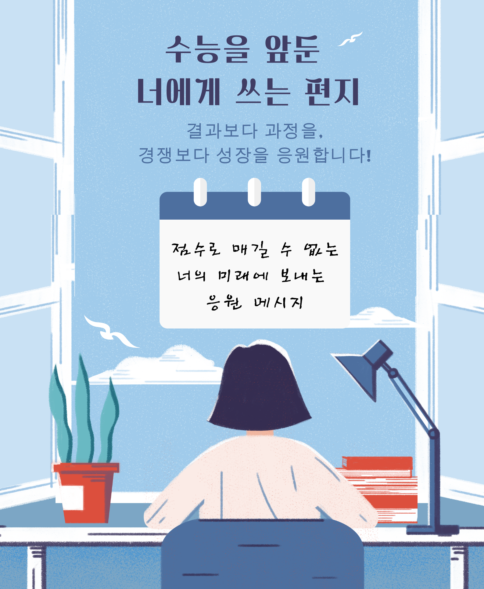 입시 경쟁 중심의 교육현실은 우리 아이들을 점수와 등급으로 판단하며 수능 대박을 외치지만, 무한 경쟁 속에서 위축되기 쉬운 아이들의 마음을 위로하고, 수능 너머에 있을 미래를 격려하기 위해 응원 편지를 보내면 어떨까요?