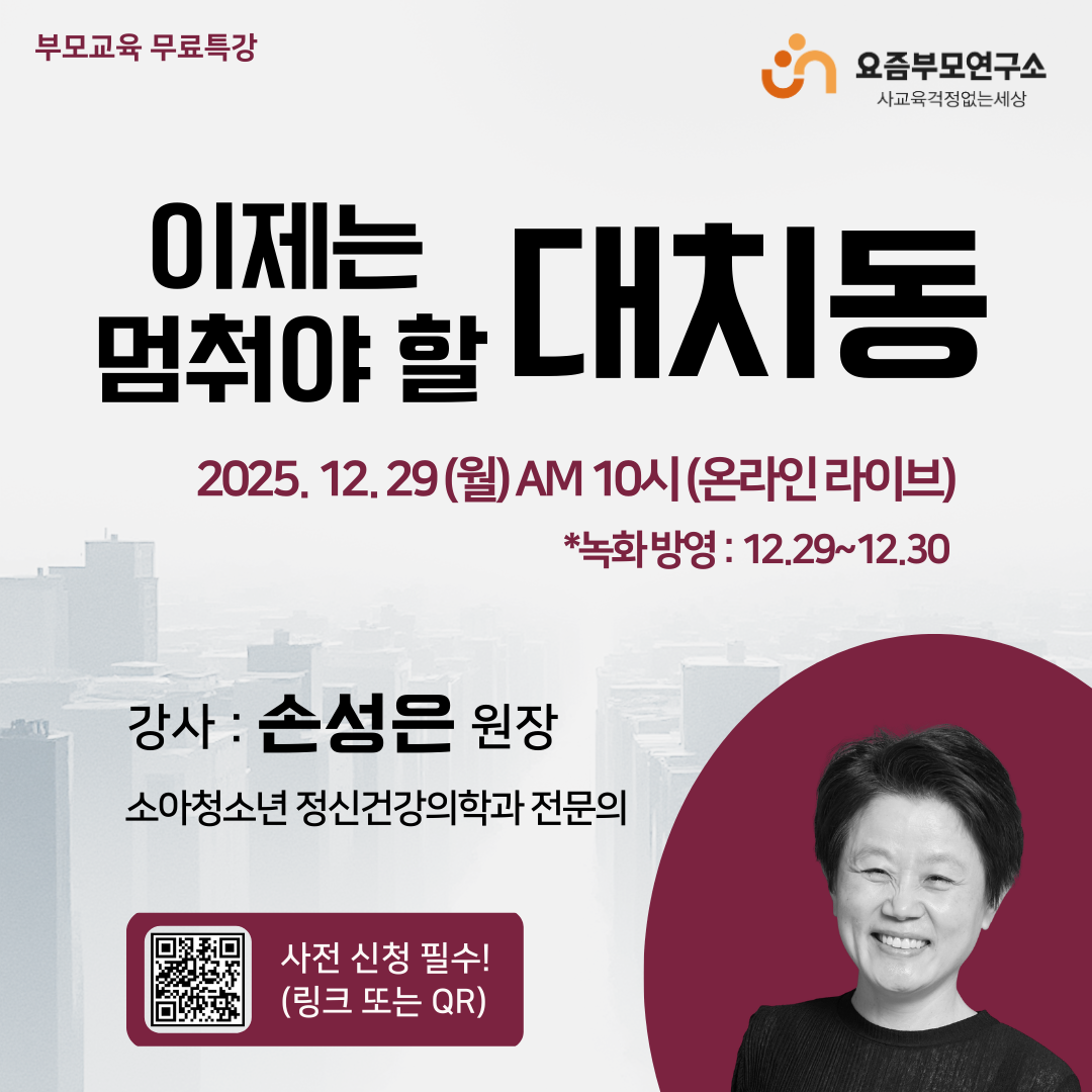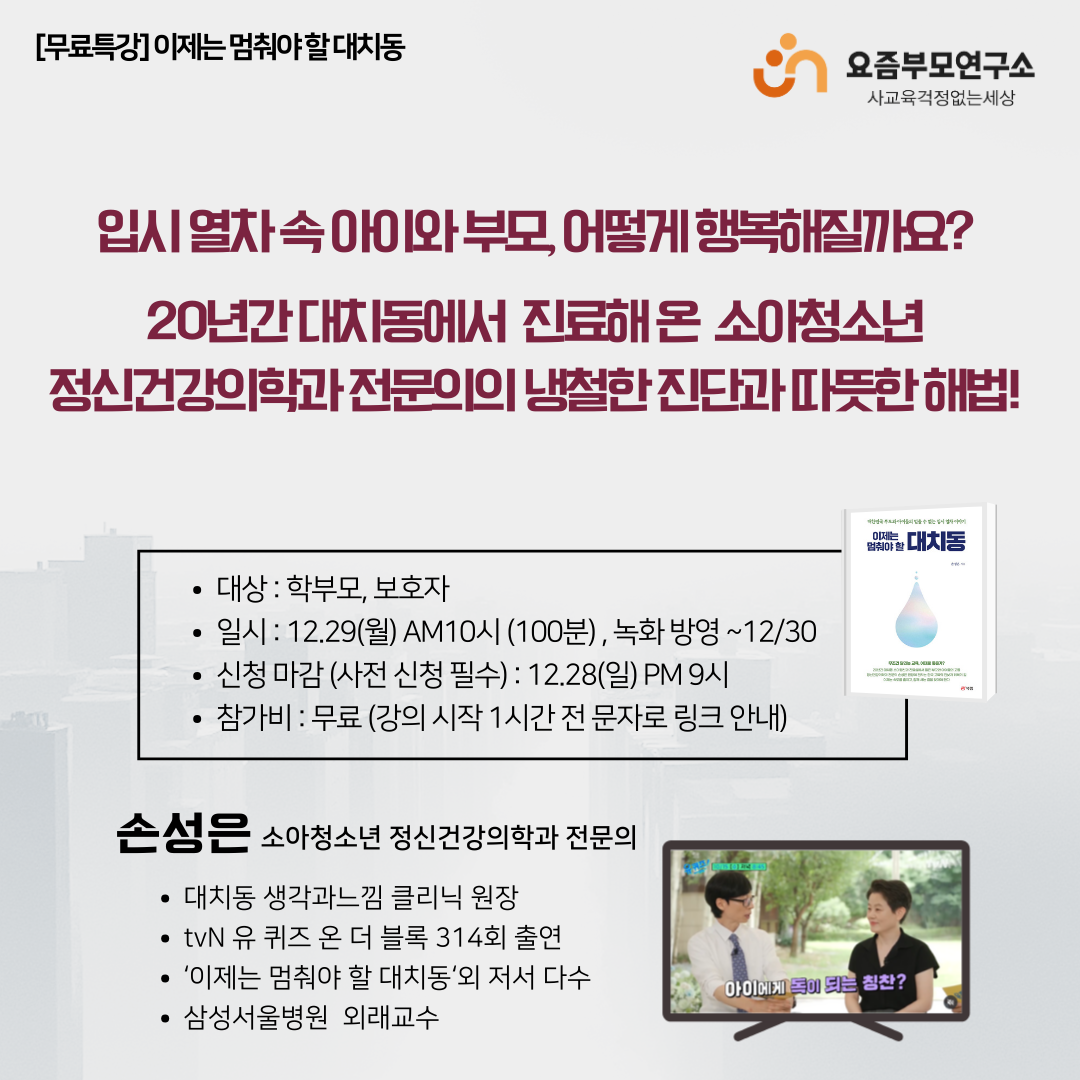 건강한 교육 정보로 요즘 부모들의 걱정을 해결하는 사교육걱정없는세상 요즘부모연구소의 온라인 무료특강, "이제는 멈춰야 할 대치동"이 열립니다. 지난 10월, tvN 유퀴즈에서 자녀교육에 관한 영감있는 이야기를 전해준 (조회수 46만회) 손성은 전문의의 깊이있는 강의를 놓치지 마세요!