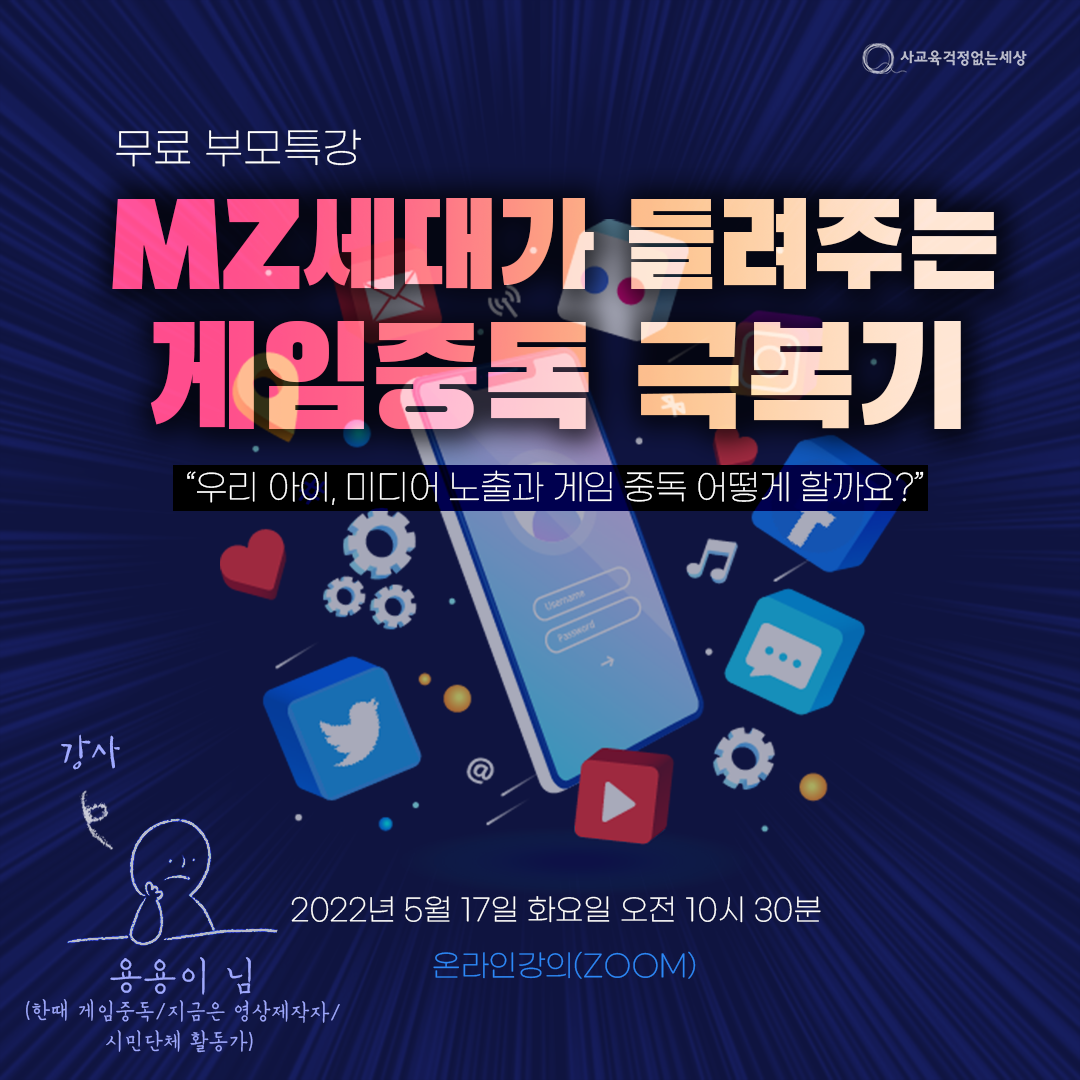 MZ세대 강사 ‘용용이’님의 게임으로 대화하는 방법, 게임으로 보는 우리 아이 성향과 친구관계, 게임과 미디어, 진로와 공부까지... 허심탄회한 이야기를 들어보세요. 특히 학부모 입장에서 질문을 던져줄 채송아 선생님의 대담형식의 강의에 많은 분들의 관심을 부탁드립니다.