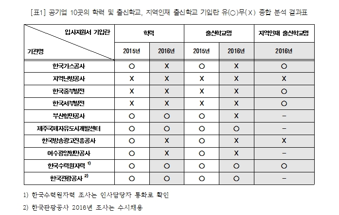 그래서 2015년에 본 단체가 조사했던 기획재정부 지정 30개 공기업의 신규채용 현황 분석에 이어, 2016년에도 입사지원서 상의 학력 기입란과 출신학교명 기입란의 유무를 확인하였습니다. 총 30곳의 공기업 중 2016년 4~5월에 공개채용이 진행되었던 공기업 10곳을 대상으로 사무직군 입사지원서 상의 학력 기입란과 출신학교명 기입란의 유무를 조사하였습니다. 조사대상 기업과 종합 분석 결과는 아래와 같습니다.
