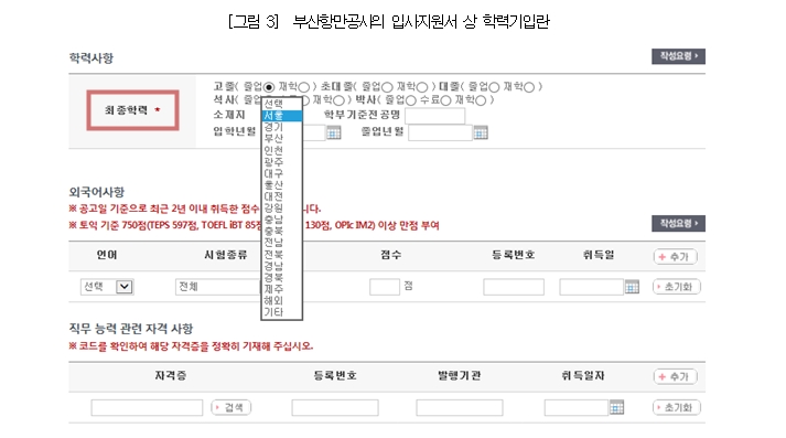 학력 기입란과 출신학교명 기입란이 있는 공기업의 사례를 보겠습니다. 먼저 부산항만공사는 출신학교명 기입란은 삭제하고, 학력 기입란을 그대로 두었습니다.