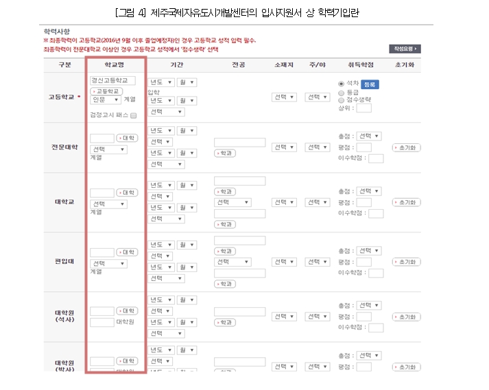 ▲ 한국수력원자력, 제주국제자유도시개발센터, 한국관광공사(수시채용)의 경우 여전히 학력 기입란과 출신학교명 기입란을 유지하고 있고, 부산항만공사의 경우 출신학교명 기입란은 삭제했으나 학력 기입란은 그대로 두어 시정이 요구됨.