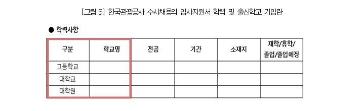 ■ 한국수력원자력, 제주국제자유도시개발센터, 한국관광공사(수시채용)의 경우 여전히 학력 기입란과 출신학교명 기입란을 유지하고 있고, 부산항만공사의 경우 출신학교명 기입란은 삭제했으나 학력 기입란은 그대로 두어 시정이 요구됨.