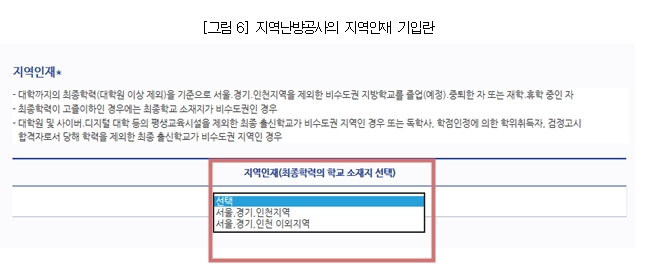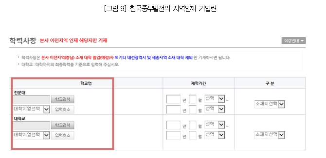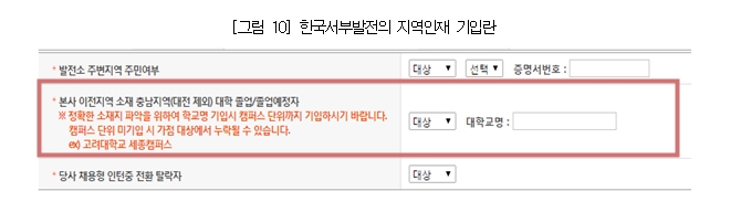 반면, 한국가스공사, 한국중부발전, 한국서부발전, 한국수력원자력은 지역인재 기입란에 지역인재의 출신학교명을 기입하도록 되어 있어서 개선이 요구됩니다. 학력이나 출신대학을 밝히지 않는 채용방식을 유지하는 데에 있어 지역인재의 경우에만 출신학교를 기재하는 것은 불합리한 방식입니다. 지역난방공사나 한국방송광고진흥공사의 좋은 사례에 기반을 둬 능력 중심 채용의 본래 취지에 맞게 지역인재 기입란에서 출신학교명 기입란은 삭제되어야 합니다.
