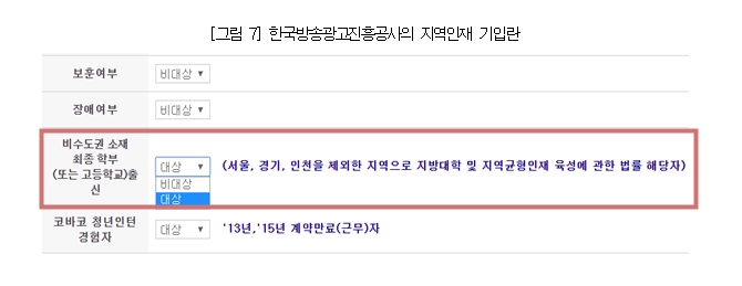 ▲ 지역난방공사, 한국방송광고진흥공사 2곳은 학력과 출신학교명을 기재하지 않을 뿐만 아니라 지역인재 전형에서도 비수도권 인재의 소재지만 기재하도록 해 비교적 좋은 사례를 보여줌.