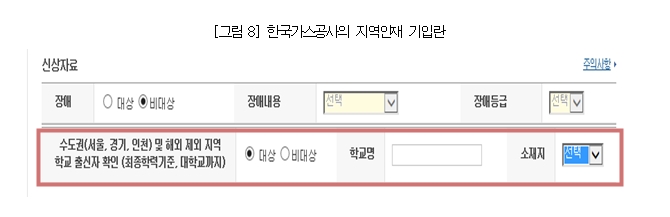 ▲ 지역인재(비수도권 지역인재, 이전지역 인재) 전형에서도 4곳(한국가스공사, 한국중부발전, 한국서부발전, 한국수력원자력(수시채용))은 출신학교명을 요구하였음.