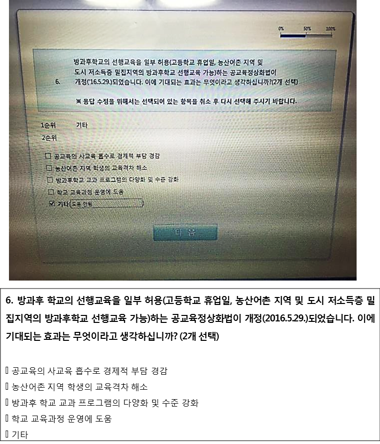 의견수렴이라 함은 다양한 생각을 수용하는 것이 기본입니다. 그러나 이 설문은 기대 효과로 생각하는 4가지 항목 중 2개를 선택하는 방식인데, 선택지가 모두 긍정적인 기대효과들 뿐입니다. 만약 부정적인 의견을 가지고 있는 응답자라면 기타에 자신의 의견을 적을 수 있습니다. 하지만 반드시 2개를 선택하게 되어 있어 부정적 의견을 가진 경우에조차도 긍정적 의견을 한가지 반드시 선택해야 하거나, 설문 조사에 응답하지 않게 됩니다. 즉, 이렇게 수집된 자료에는 개정안에 대한 부정적인 여론이 반영되지 않거나 왜곡된 결과가 나오는 것입니다. 이 설문조사는 편향된 여론만을 반영하는 설문조사입니다. 교육부는 즉각 이 설문조사를 중단하고, 현재까지 수집된 자료를 폐기해야 합니다. 그리고 진정 국민의 목소리를 들을 생각이라면 다양한 의견을 수렴할 수 있는 설문 문항으로 다시 설문조사를 진행해야 할 것입니다.