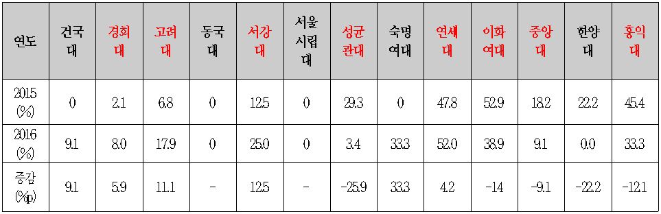 사교육걱정의 논술고사 분석 결과 발표에 대해 교육부는 현재 ‘16학년도 대학별고사의 출제문항을 7월까지 조사·분석하고 있으며, 결과에 따라 교육과정정상화심의위를 거쳐 시정명령 등 행정조치를 취할 예정이라 밝히고 있습니다. 더불어 이 결과를 ’17 고교교육 정상화 기여대학 지원사업 평가에도 반영할 계획이라고 설명하고 있어, 마치 정상적인 절차를 이행하고 있는 것처럼 해명하고 있습니다. 그러나 이는 사실과 매우 다릅니다. ‘공교육정상화촉진 및 선행교육규제에 관한 특별법’(이하 선행교육규제법)이 2014년 4월 국회에서 통과되고 그해 9월부터 발효된 후 교육부는 2015학년도 대학별 고사의 고교 교육과정 위반 여부에 대한 조사·분석을 시행했어야 하고 그 결과에 따라 시정명령 등의 행정조치를 취했어야 합니다. 그러나 조사·분석했는지 여부는 알 수도 없고, 그에 따라 교육과정정상화심의위를 단 한 차례도 개최한 적이 없습니다. 그러니 어떠한 시정명령 등을 취하지도 않았고, ‘16 고교교육 정상화 기여대학 지원사업에 반영하지도 않았습니다. 사교육걱정이 2015학년도와 2016학년도 계속 분석한 결과를 보면, 2015학년도에 고교 교육과정 위반 대학이 9개 대학에 이르고, 2016학년도에는 10개 대학에 이릅니다(아래 표 참조). 2개년도 모두 위반한 대학이 8개 대학에 이릅니다. 선행교육규제법 14조 1항에 의하면 교육부장관은 1차 위반한 대학에 대해 시정명령을 취할 수 있고, 미이행시에는 행정 처분의 세부 기준에 의해 입학정원의 10% 범위 내에서 모집 정지를 하도록 되어 있습니다. 그런데 ‘15학년도에 법 위반한 대학에 대해 아무런 시정명령 등의 행정조치를 취하지 않았기 때문에 ’16학년도에 또다시 위반한 대학들에 대해 입학정원 모집 정지 등의 조치를 취할 수도 없는 상황이 된 것입니다. [표1] 2015․2016학년도 비교표: 주요 13개 대학 자연계 논술전형 교육과정 미준수 문항 출제 비율 (*붉은 색 부분은 선행교육규제법 제정 이후 2년 연속 교육과정 미준수 문항 출제한 대학들)  또한 교육부는 고교 교육과정을 위반한 대학들에 대해 고교교육 정상화 기여대학 지원사업 평가에도 반영한다고 밝히고 있지만 ‘15학년도 대학별 고사 분석 결과가 ’16 고교교육 정상화 기여대학 지원사업에 반영한 흔적을 어디에서도 발견하기 어렵습니다. 즉 대학별고사의 하나인 구술고사를 실시하여 고교 과정을 심각하게 위반하고 있는 서울대의 경우 가장 많은 20억을 지원받았고, 2년 연속 교육과정을 위반한 고려대의 경우 세 번째로 많은 금액인 16억6천3백만원, 경희대 19억1천만원, 서강대 7억2천만원, 성균관대 4억7천만원, 연세대 3억1천만원, 이화여대 7억1천만원 등 2년 연속 위반 대학 모두가 지원받았습니다.