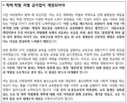 조희연 서울시교육감이 ‘학력·학벌 차별금지법’ 제정에 적극적인 동참 의지를 밝혔습니다.