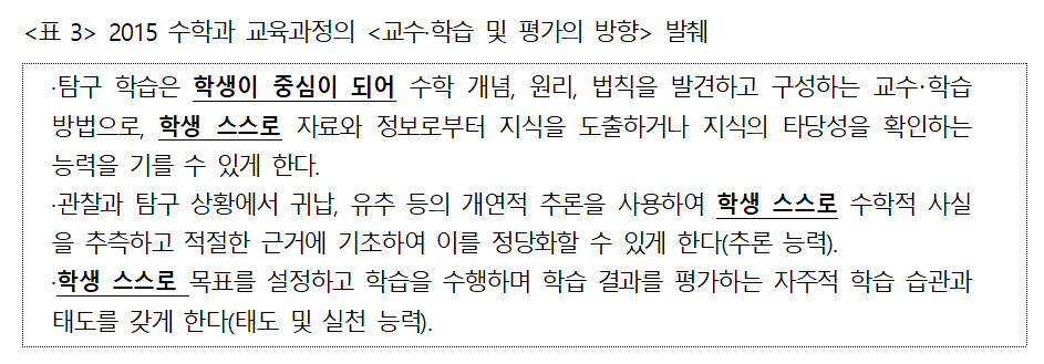 <표 2>에서 본 바와 같이 2015 개정 교육과정의 총론은 수업의 형태가 ‘학생 참여 중심의 수업’이 되어야 함을 제시하고 있습니다. 암기보다는 교과 지식의 심층적 이해의 강조, 융합적 사고의 신장을 위해서 직접 체험 활동, 소집단 공동 학습 활동, 자기 생각을 많이 표현할 수 있는 수업 문화의 조성을 통한 능동적 참여 가능성 확대, 배운 내용을 적용하고 활용하여 자기 것을 소화하고, 이 과정을 자기 주도적으로 수행하며 반성을 할 수 있도록 하고 있습니다. 2015 개정 수학과 교육과정의 <교수⦁학습 및 평가의 방향> 여러 군데에서도 다음과 같이 ‘학생 스스로’라는 문구를 발견할 수 있습니다.