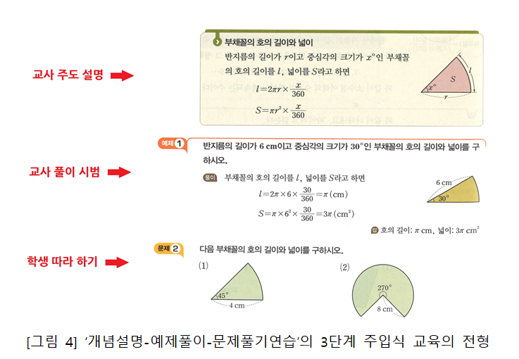 10종의 교과서가 모두 ‘개념설명–예제풀이–문제풀이연습’으로 이어지는 우리나라의 전형적인 3단계 설명식 교수 방식의 구성을 탈피하지 못했습니다. 발견학습이나 탐구학습이라는 용어가 무색할 정도입니다.