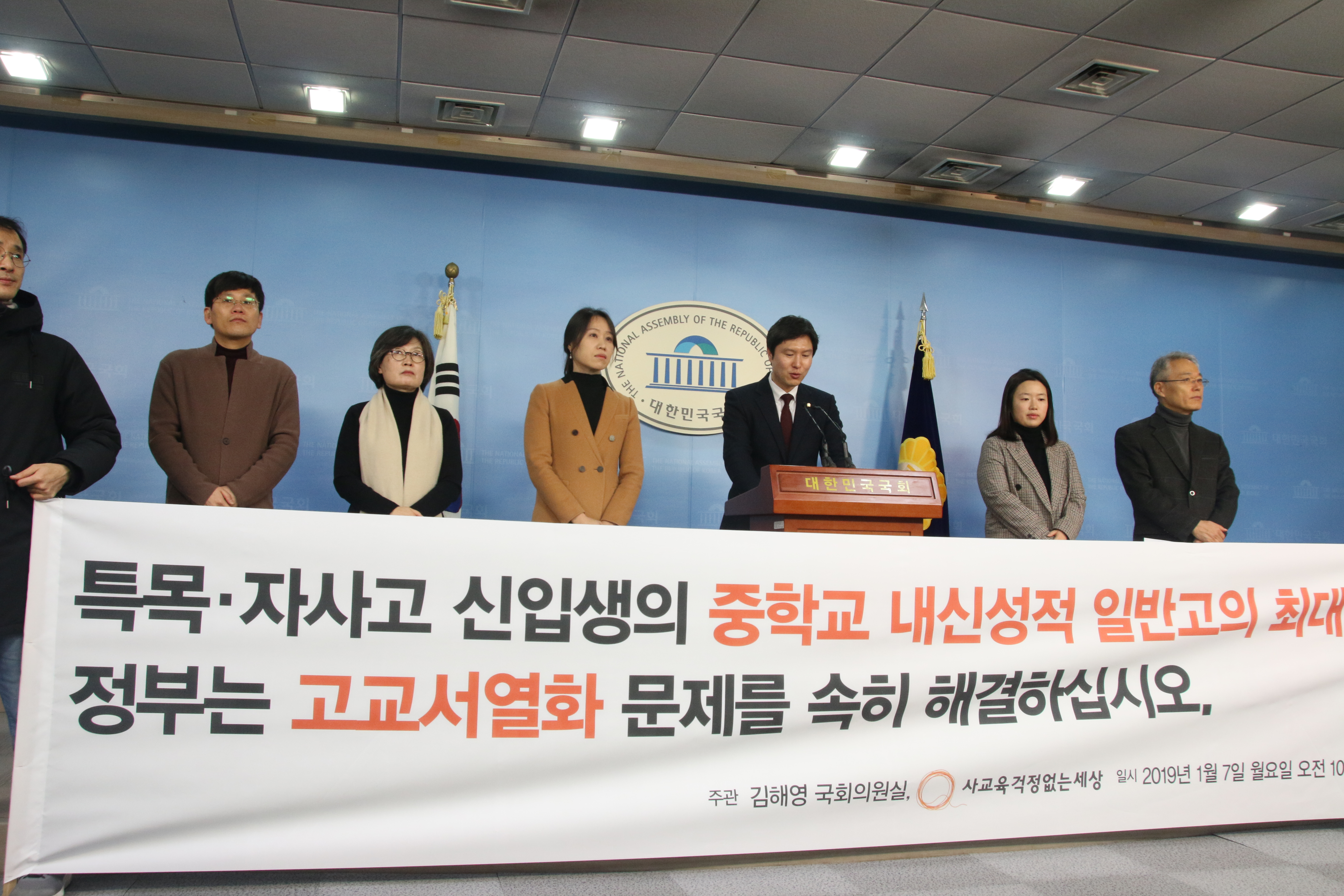 ▲ 김해영 국회의원과 사교육걱정없는세상(이하 사교육걱정)은 1월 7일(월) 오전 10시, 국회 정론관에서 외고・국제고・자사고 및 일반고 2018학년도 신입생의 중학교 내신 성적 전수 분석 결과를 발표하는 기자회견을 개최함. 분석 결과 이들 학교에 과도한 우수학생 쏠림현상을 확인하였음.