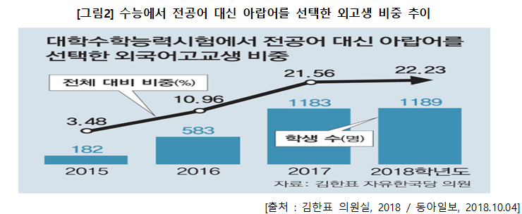 이를 입증하는 자료는 많이 있습니다. 지난 국정감사 자료에 의하면 [그림1] [그림2]와 같이 지난 5년간 외고 출신 학생 3명 중 1명 정도만 어문계열 대학에 진학하는 것으로 나타났고, 대학수학능력시험에서 본인의 전공어 보다 시험에 유리한 아랍어를 선택한 외고생의 비중이 계속 증가하고 있는 등 당초 설립 목적을 상실하고 입시에 유리한 학교로 운영되고 있다는 것이 재차 확인되었습니다.