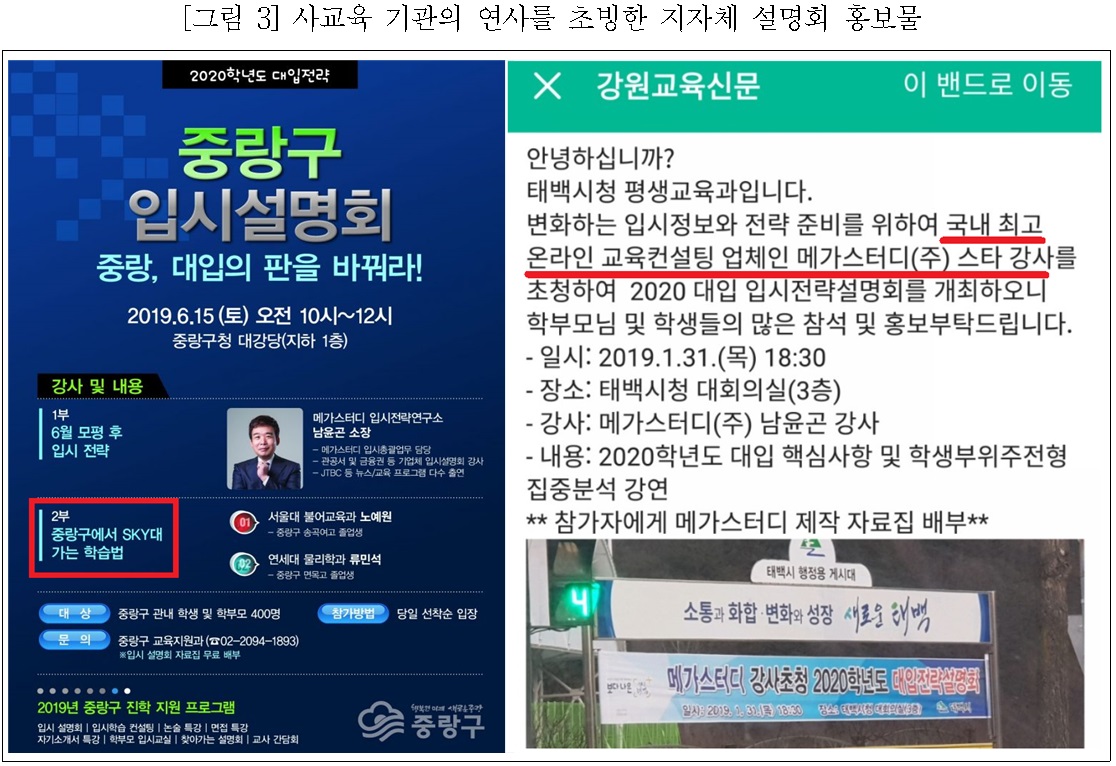 ■ [입시설명회 실태 연속보도 ①]사교육 강사를 초빙하는 지방자치단체 입시설명회에 대한 비판보도(2019.11.14.)