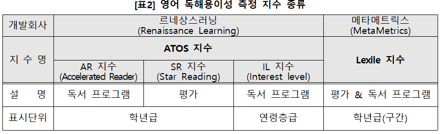 국내에서는 해당 지수가 AR 지수(Accelerated Reader Book Level) 또는 SR 지수(Star Reading Assessment)로 알려져 영어학원 레벨테스트 및 영어책 도서관 등에서 활용되고 있으며, 두 지수 모두 동 회사에서 ATOS 지수를 활용하여 개발한 상품으로, AR은 독서 프로그램이고, SR은 시험입니다. 본 분석에서는 편의상 ATOS지수를 AR 지수로 통칭하겠습니다.