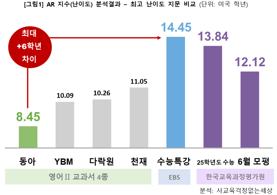 또한 수능연계교재 <EBS 수능특강>의 평균 난이도(9.78) 및 최고 난이도(14.45)가, 25학년도 수능 및 6월 모의평가의 평균 난이도(9.81, 9.32) 및 최고 난이도(13.84, 12.12)와 유사하거나 1~2학년 더 높은 것으로 나타났습니다. 또, 교과서의 평균 난이도(7.45~8.99)와 최고 난이도(8.45~11.05)에 비해서도 1~6학년 더 높은 것으로 나타났습니다.