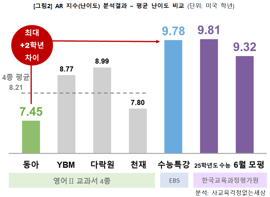 2025학년도 수능 및 2026학년도 수능 6월 모의고사 지문의 평균 난이도는 각각 9.81, 9.32학년, 수능 연계교재 <EBS 수능특강>은 9.78학년으로, 영어Ⅱ 교과서 4종의 평균 난이도인 8.21학년을 1-2학년 가량 상회함.
