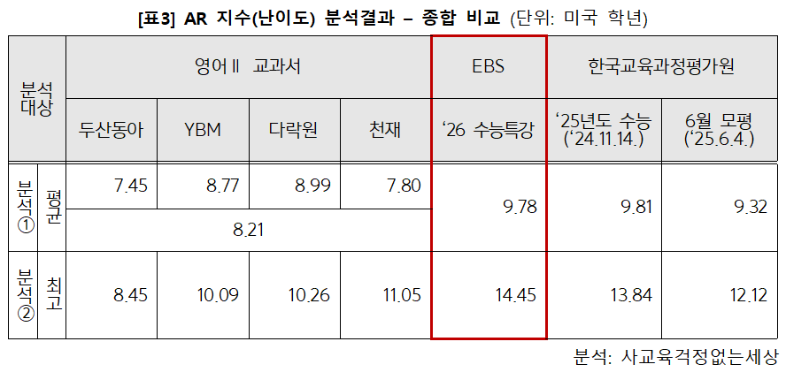 2025학년도 수능 및 2026학년도 수능 6월 모의평가 지문의 최고 난이도는 각각 13.84 및 12.12학년, <EBS 수능특강>은 14.45학년으로, 영어Ⅱ 교과서 4종 본문의 최고 난이도인 8.45~11.05학년을 최대 6학년 상회함.