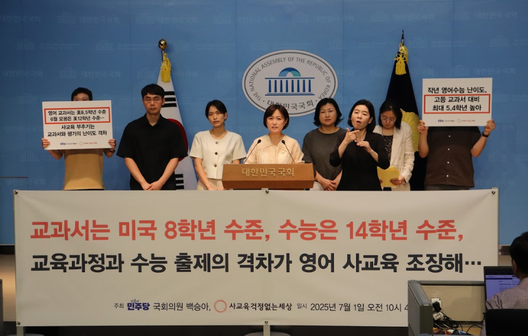더불어민주당 백승아 국회의원과 사교육걱정없는세상(이하 사교육걱정)은 2025년 7월 1일(화) 오전 10시 40분에 국회 소통관에서 2025학년도 대학수학능력시험(이하 ‘25학년도 수능’) 영어영역 독해문항, 2026학년도 대학수학능력시험 6월 모의평가(이하 ‘6월 모평’) 영어영역 문항, 고교 교육과정 ‘영어Ⅱ’ 교과서 4종 본문, 그리고 EBS 수능특강 독해지문의 난도 비교 분석 결과를 발표하는 기자회견을 개최했습니다.