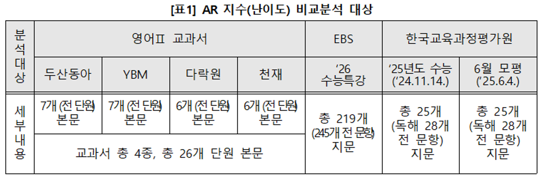 분석대상과 관련해서는, 수능의 영어영역 시험범위가 고교 영어Ⅰ(주로 고교 2학년 1학기에 편성)에서 영어Ⅱ(주로 고교 2학년 2학기에 편성)까지로 지정되어 있어, 국내 공교육 이수 시 도달가능한 수준을 판별하기 위해 영어Ⅱ 교과서 4종(두산동아, YBM, 다락원, 천재교육)의 모든 단원의 본문 독해지문을 분석대상에 포함하였습니다. 또, 수능 출제당국인 한국교육평가원에서 실시한 25학년도 수능과 6월 모의평가의 영어영역 독해 문항 28개씩, 그리고 ’26학년도 수능 연계교재인 <EBS 수능특강>의 모든 지문 219개도 분석대상에 포함하였습니다.