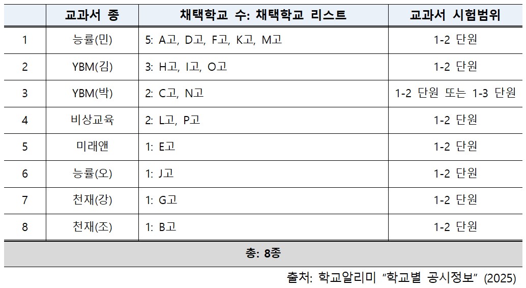 16개 고교가 채택한 ‘공통영어Ⅰ’ 교과서 및 시험범위는 다음 표와 같습니다. |