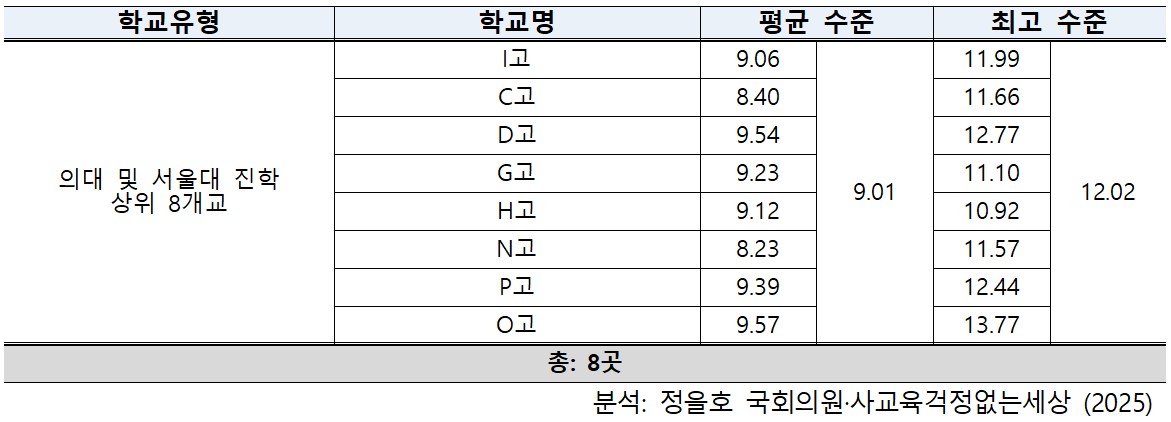 의대 및 서울대 진학 상위 8개교 내신시험의 평균 수준은 9.10학년으로 나머지 8개교 평균인 8.26학년보다 0.84학년이 더 높았으며, 최고 수준은 12.02학년으로 나머지 8개교 평균 11.90학년을 살짝 웃돌았습니다.