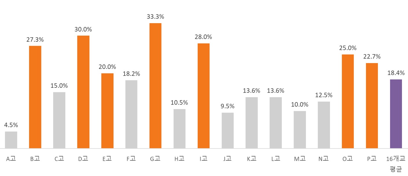 서울의 사교육과열지구와 비사교육과열지구 고교간 비율을 비교해보면, 서울의 사교육 과열지구인 강남구, 서초구 4개교(A고, B고, E고, F고)의 평균 비율은 17.7%로 비사교육 과열지구인 구로구, 금천구의 4개교(L고, M고, J고, K고: 11.8%)보다 약 6%p가 높았습니다.