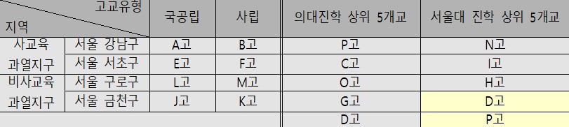 ※ 서울 4개구에서 8개교, 의대‧서울대 진학 상위 10개교 중 일부 중복을 포함해 총 16개교를 분석 대상으로 삼았습니다.