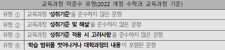 ▲ 분석방법: ❶ 수학: 고교 수학교사 18명과 교육과정 전문가 2명이 참여해 시험범위인 ‘공통수학Ⅰ‧Ⅱ’의 성취기준과 성취수준을 바탕으로 아래 4가지 기준에 따라 교육과정 미준수 문항을 판정했음. |