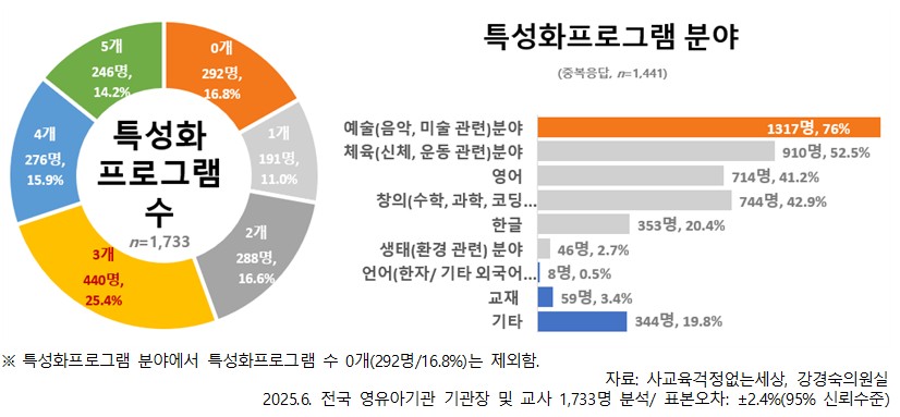 ■ [특성화프로그램 현황] 영유아기관의 82.9%가 최소한 1개 이상의 특성화프로그램을 운영하고 있으며, 3개의 특성화프로그램을 운영하는 기관이 25.4%로 가장 많았음. 주요 운영 분야별로는 예술 분야가 76%로 가장 많았으며, 체육 분야 52.5%, 창의 분야 42.9%, 영어 41.2% 순으로 나타남. 영유아기관의 82.9%는 최소한 1개 이상의 특성화프로그램을 운영하고 있으며, 그중 3개의 프로그램을 운영하는 기관이 25.4%로 가장 많았습니다. 특히 3개 이상의 프로그램을 운영하는 기관은 전체의 55.5%(3개 25.4%, 4개 15.9%, 5개 이상 14.2%)에 달해 상당수 기관이 여러 분야에 걸쳐 특성화프로그램을 운영하는 것으로 나타났습니다. 특성화프로그램 분야별 운영 비율에서는 예술(음악·미술 관련) 분야가 76.0%로 가장 높았고, 체육(신체·운동 관련) 분야가 52.5%, 창의(수학, 과학, 코딩 관련) 분야가 42.9%, 영어가 41.2% 순으로 높은 운영률을 보였습니다. 반면, 한글 교육은 20.4%에 그쳤으나, 생태, 기타 등의 특정 분야는 상대적으로 낮은 운영률을 보였습니다. 이러한 프로그램은 영유아 발달 단계에 맞춰 놀이 중심으로 설계되어, 신체적 발달과 두뇌 발달, 그리고 창의력 증진을 동시에 촉진하는 교육적 특성을 지니고 있습니다. 그러나 영어의 높은 비중은 조기 영어 노출을 통해 영유아가 심리적 거부감 없이 영어를 자연스럽게 습득하도록 돕기 위함일 수 있으나, 만약 인지 학습적 접근으로 진행될 경우, 모국어 학습 방해, 스트레스 유발, 인지 발달 저해와 같은 발달 및 학습의 역효과를 초래할 수 있습니다. 또한 ‘1일 1시간 1과목’ 이라는 운영 기준을 고려할 때, 5개 이상의 과목을 동시에 진행하는 기관에서는 교사와 영유아 모두에게 과중한 부담으로 작용할 수 있습니다. 즉, 너무 많은 프로그램을 운영할 경우 개별 프로그램의 깊이와 질이 저해되고, 영유아의 충분한 휴식과 자발적 놀이 시간이 줄어들 위험이 있습니다. 따라서 프로그램의 과도한 확대가 영유아와 교사의 부담으로 전락하지 않도록 현장 상황과 부담을 충분히 감안한 특성화프로그램 교육과정 재구성 및 관리가 병행되어야 함을 시사합니다. |