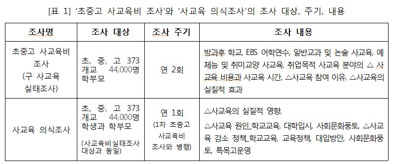 ▲ ‘사교육 의식조사’는 사교육의 실질적 영향 및 효과와 사교육의 원인, 그리고 사교육비를 감소시키기 위한 정책들의 효용성을 교육 당사자인 학생과 학부모에게 직접 묻는 조사였음. 교육 현장의 목소리를 듣고, 정책에 반영하고, 이듬해 조사를 통해 이에 대한 피드백을 받을 수 있는 쌍방 소통이 가능한 유일한 조사였음.