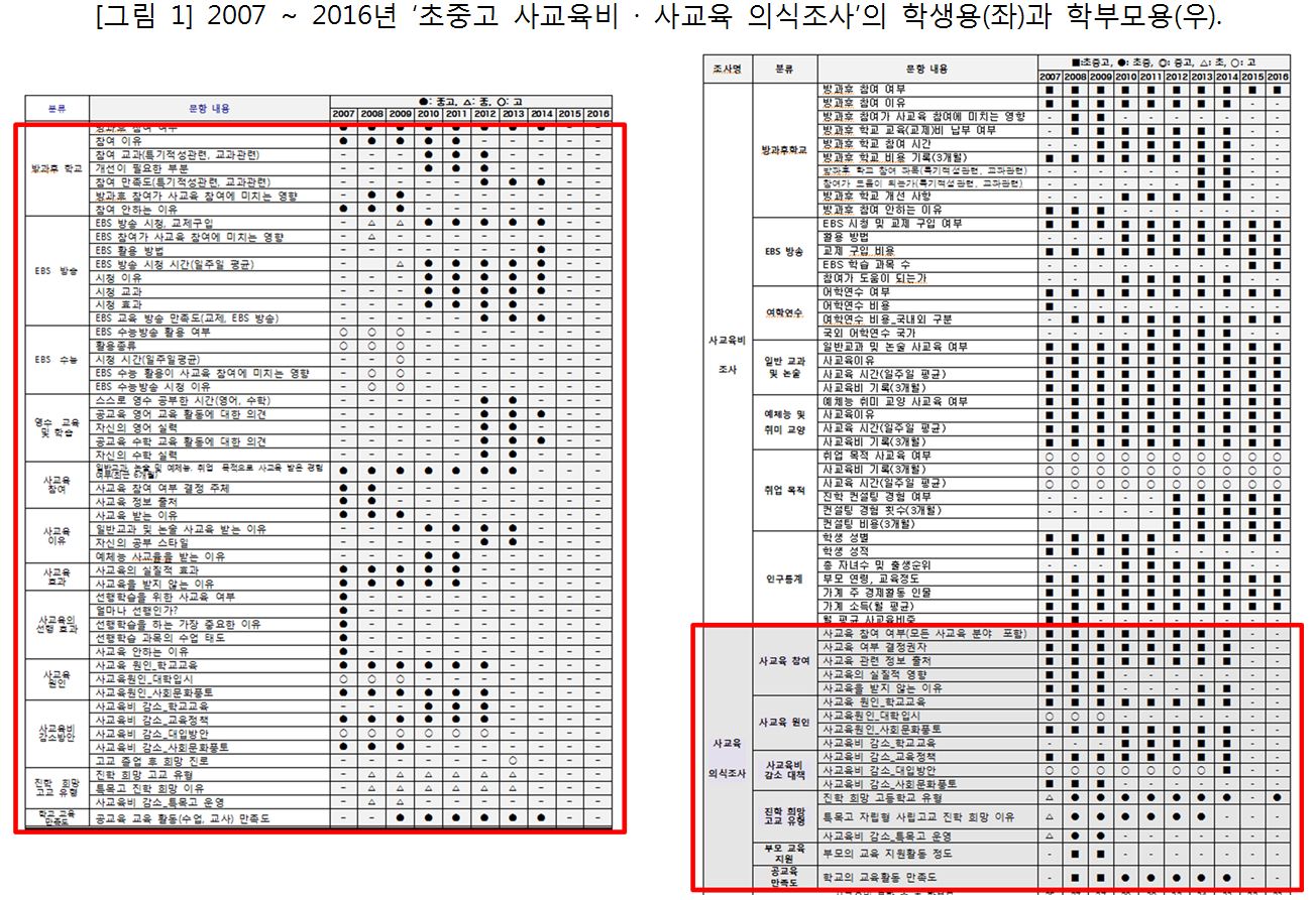 ‘사교육 의식조사’의 가장 중요한 점은 당사자인 학생에게 이 문제를 직접 물어봤다는 점입니다. 그리고 정부는 이 결과를 세부적이고 구체적으로 분석해 사교육 문제를 해결할 수 있는 정책들을 마련해 왔었습니다. 특목고 입시제도를 바꿨고, 선행학습 금지법을 만들고 학원비 안정화를 위한 시스템을 만들었고, 교원 평가제, 수준별 이동수업, EBS, 방과후 학교 등을 통해 공교육 정상화와 사교육비 경감을 유도했습니다. 그리고 이런 정책들의 효과를 이듬해 조사를 통해 당사자들에게 실제 효과가 있는지를 물어봤습니다. 이런 쌍방 소통을 통해 국민들은 정부가 사교육 문제를 해결하려는 의지를 가지고 있음을 매년 느낄 수 있었고, 교육정책에 대한 신뢰와 미래는 달라질 것이라는 기대와 희망을 가질 수 있었습니다. 그런데 2010년부터 사교육 원인 중 대학 입시관련 질문, 사교육 감소 정책 중 사회문화풍토 관련 질문을 하지 않더니, 2012년에는 사교육의 실질적 영향, 사교육 원인, 사교육비 감소 정책에 대한 질문을 당사자인 학생들에게 묻지 않으며 질문 영역을 점점 줄이더니 2015년에는 아애 ‘사교육 의식조사’를 중단을 선언하였습니다[그림 1](자세한 사항은 첨부파일 참고).