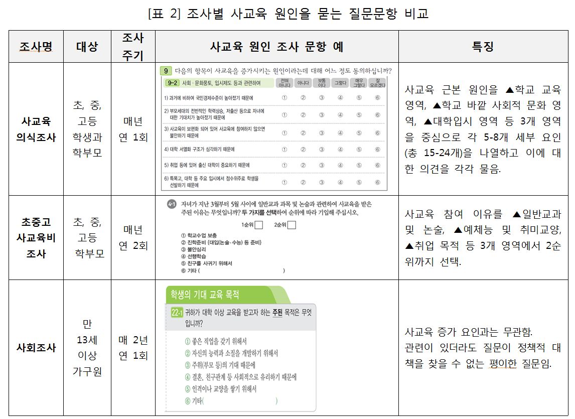 1. 교육부는 ‘사교육 의식조사’를 다시 시작하십시오. 이를 통해 여전히 치솟고 있는 사교육비 문제에 대한 원인과 대책을 찾아야 합니다.