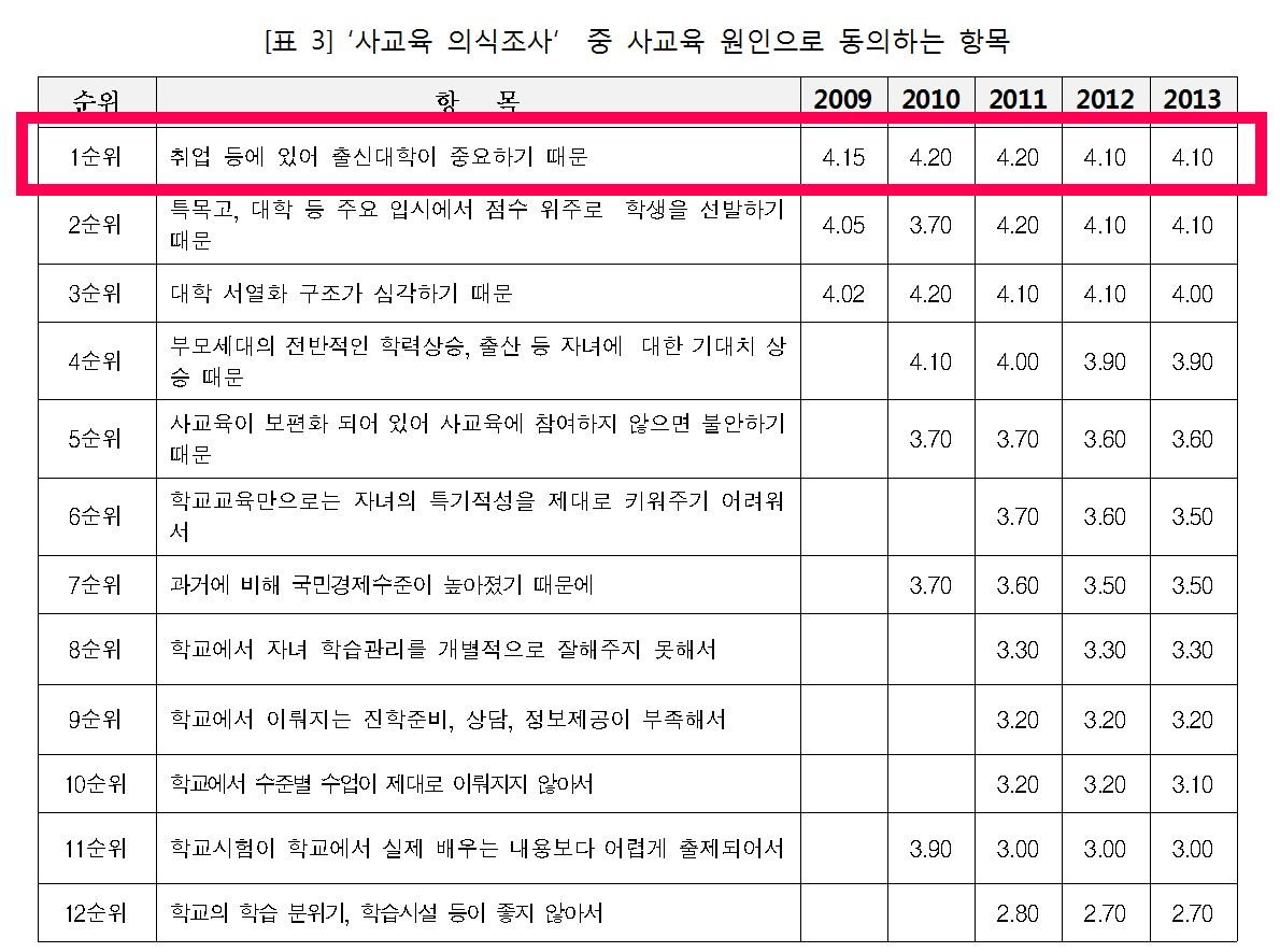 더불어 ‘사교육 의식조사’에서 일관되게 사교육비 지출의 가장 큰 이유로 지적된 ‘취업 등에 있어 출신 대학이 중요하기 때문’ 이라고 대답한 국민들의 응답을 새겨 들어야합니다<표 3>. 학부모는 자녀가 좋은 학교에 가지 않으면 차별받기 때문에 이 무리한 사교육 경쟁을 벌이고 있습니다. 정부가 입시와 채용에서 학생이 출신학교로 차별받지 않고 공정한 경쟁 기회를 얻도록 최소한의 여건을 마련해주는 것은 당연하며 사교육 문제 해결에서도 중요합니다. 이를 위해 출신학교 차별 금지법 제정 같은 사교육비 경감을 위한 근본 대책을 세워야 합니다.