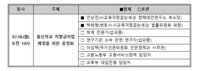 ■ 출신학교 차별 금지법 제정을 위한 국회 공청회 예고 보도(2016. 7. 12.)