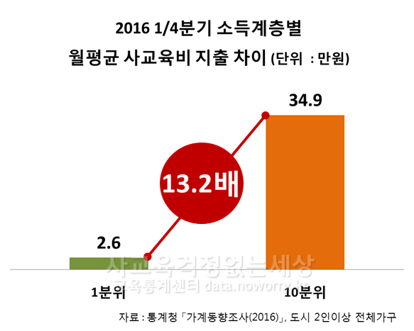 ※2015년 1/4분기, 20165년 1/4분기 기준, 소득 1분위(저소득층)와 소득 10분위(고소득층)의 사교육비가 각각 2.7만원(2015년), 2.6만원(2016년)에서 각각 36.8만원(2015년), 34.9만원(2016년)으로 저소득층과 고소득층 간 13.2배~13.5배의 차이가 났음. (통계청 조사 결과를 사교육걱정없는세상이 가공)
