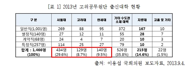 2013년 고위 공무원단 출신대학 현황을 보면 SKY 대학을 중심으로 한 상위권 대학들의 공직 점유율은 상상을 초월합니다. SKY 3개 대학이 차지하는 비율이 무려 47.9%로 절반에 육박하고 있고, SKY 대학과 수도권 소재 대학이 아닌 지방대와 고졸 출신은 16.1%에 불과합니다. 지방대 출신으로서 고위 공무원단에 속하는 것은 바늘구멍 들어가기와 같은 현실입니다.