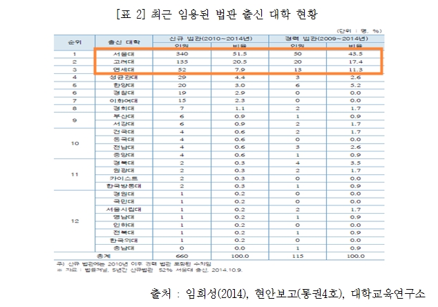 또한, 2010년부터 2014년까지 최근 5년간 임용된 신규 법관 중 SKY 대학이 차지하는 비율이 79.9%, 경력 법관은 72.2%에 이르러 전체 법관 중 76.1%를 차지하고 있습니다. 서울대 한 대학만 놓고 보더라도 무려 신규 법관의 51.5%, 경력 법관의 43.5%로, 전체의 47.5%라는 어마어마한 비중을 독차지하고 있습니다. 법관은 서울대의 세상이라고 해도 과언이 아닙니다.