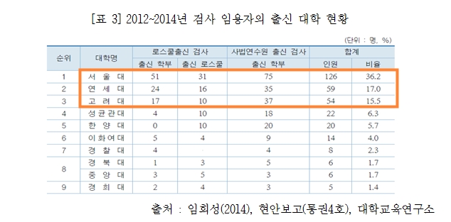 검사 임용 실태를 보면, 2012년부터 3년간 임용된 검사의 경우 로스쿨 출신과 사법연수원 출신 검사 모두 합하여 SKY 대학 학부 졸업생이 68.7%에 이릅니다. 법관의 비율에 약간 미치지 않지만 이 역시 전체의 3분의 2에 이르는 어마어마한 비중입니다.