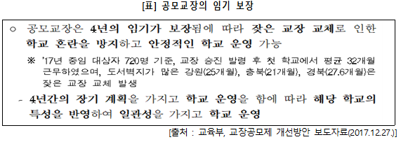 또한 교장의 직위는 학교경영에 막중한 책임감을 가져야 함에도 승진제에 의한 교장의 경우 4년 임기 중 평균 3년을 채 근무하지 못하였고 이로 인해 안정적인 학교 운영이 불투명했습니다. 이제 교장공모제의 확대와 4년 임기 보장으로 일관성을 가진 학교 운영을 기대할 수 있을 것입니다.