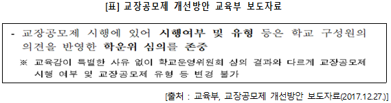 ▲ 다만, 교장공모제의 시행에 있어 가장 중요한 사항은 각 학교 단위에서의 공모제 시행여부 및 유형을 결정하는 것임. 교육부의 개선 방안에 나와 있는 ‘학교 구성원의 의견을 반영한 학교운영위원회 심의 존중’에 대한 내용을 더욱 명료하게 규정하고 구체적인 절차와 방침을 제시해야 할 것임.