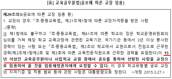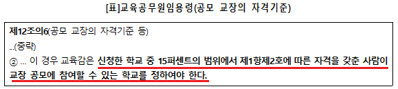 우리「교육공무원법」 또한 승진 위주의 교직 문화를 개선하여 능력있는 인재를 교장으로 임용하하기 위해 비록 교장자격 소지자가 아니라 하더라도, 15년 이상의 교육 경력이 있는 교원들은 교장 공모에 참여할 수 있도록 하는 내부형 교장공모제를 규정하고 있습니다.