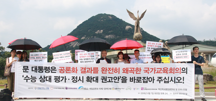 오늘 국가교육회의 대입특위에서 수능 상대평가 유지 - 정시 확대를 결정하고 이를 교육부에 권고하기로 했습니다. 이는 공론화 위원회 490명 시민참여단의 민의를 왜곡한 잘못된 권고안으로서 우리는 이를 수용할 수 없습니다. 이에 우리 교육 단체들과 오피니언 그룹들은 이번 국가교육회의의 결과는 490명 시민들에 의한 대입공론화 결과를 왜곡 해석한 것으로서 이를 수용할 수 없으며 문 대통령께서 “수능 상대평가-정시 확대” 결정을 바로잡아 주시기를 촉구합니다.