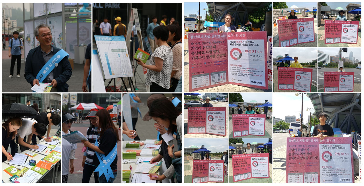 사교육걱정은 지난 4년간 펼친 출신학교 차별금지법 제정을 위한 국민운동을 펼치면서, 서명운동 뿐만이 아니라 국회 앞 1인시위(2016년 하반기 전체 진행, 2019년 현재 124일차), 전국 공청회, 출신학교 차별 사례 모집, 프로필 사진 게시 운동, 평등선언문 낭독, 기자회견, 국회 토론회 등을 통해 국민들의 법 제정에 대한 요구를 확인할 수 있었습니다.