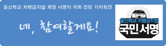20대 국회는 2020년 4월을 기점으로 문을 닫게 됩니다. 지금 이 법을 제정하지 못하면 이제까지 국민과 함께 이뤄낸 결실들은 물거품이 되며, 모든 노력을 처음부터 다시 시작해야 합니다. 시민들께 요청드립니다. 지금까지는 서명, 1인시위 등 간접적으로 출신학교 차별금지법 제정을 바라는 마음을 전달하셨다면 이제는 전국 각지에서 모아주신 서명지 박스를 품에 안고, 의원실에 직접 전달하는 일에 동참해 주십시오. 출신학교 차별금지법 제정을 바라는 분들의 많은 참여를 부탁드립니다. 참여신청은 아래 배너를 클릭해 주시면 됩니다.