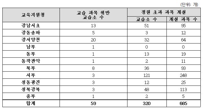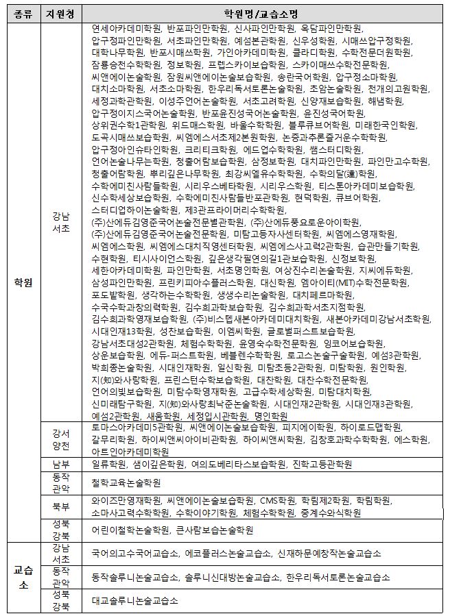 2. 서울시교육청 및 각 교육지원청은 현행 교습소의 교습 정원 위반 및 추가 과목 개설 등의 불법 행위에 대해 즉시 지도감독을 실시하고 행정처분에 나서십시오