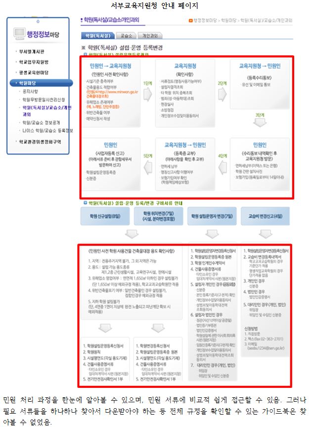 본청과 지원청은 민원인에게 홈페이지나 가이드북 등을 통해 규정과 방법을 안내하고 있습니다. 그러나 대다수의 홈페이지에서 학원 및 교습소 관련 안내 페이지를 직관적으로 찾기 어려웠으며, 어렵게 찾더라도 누적된 공지사항 중 해당 안내문을 찾아 서식을 다운로드 받기 위해 상당한 시간을 쏟아야 했습니다. 또한 이런 복잡한 절차를 한번에 이해할 수 있도록 가드북을 제공하는 곳은 1군데 밖에 없었습니다. 심지어 그 가이드북을 다운받기 위해서는 10번이 넘는 클릭을 해야 했습니다[그림1 참고].