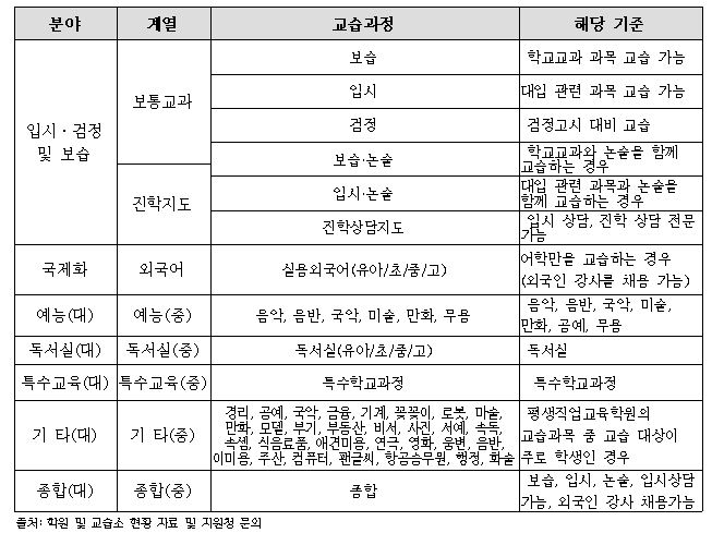 세 번째 문제점은 교습과목 분류 체계에 대한 설명이 모호하고 분류 기준도 실제 학원 운영 상황과 괴리가 있다는 것입니다. 학원의 경우 등록 시점에서 학원 종류와 분야(학원 등록 서식에는 교습과정이라 잘못 표기되어 있음)를 기재하도록 되어 있습니다. 그리고 이후 교습비 등록 과정에서 교습과정 및 교습과목을 적도록 되어 있는데, 이 과정에서 참고해야 할 ‘학원 교습과정 안내’의 설명이 모호합니다. 예컨대 학원 분야에서 초중등 교육과정에 속하는 교과를 ‘입시?검정 및 보습’으로 정의하고 있는데 학교 교육과정의 범위와 내용이 어디까지인지에 대한 설명은 전혀 없다는 점이라든지, 국제화 교습과정의 경우 ‘보통교과에 속하지 않는 교과로서 유아 또는 초등학교?중학교?고둥학생을 주된 교습대상으로 하는 실용 외국어’로 정의하고 있는데 실용 외국어와 보통 교과에 속하지 않는 외국어를 어떻게 구분할 수 있는지에 대한 기준 등이 없다는 점입니다. 이런 상황에서 한번 등록한 계열, 교습과정은 변경이 불가하고, 변경을 위해서는 다시 학원을 등록해야 하기 때문에 혼란이 가중되고 있습니다. [표3] 학원 교습과정 안내  게다가 한 학원에서 전 과목 보습과 입시, 진학지도까지 모든 것을 포함하고자 하는 학원들이 늘어나면서 이를 분류하기 위한 교습과정이 추가되었고, 그 결과 [표4]와 같이 행정적 분류 외의 다른 정보는 전혀 포함하지 않는 체계가 만들어졌습니다. 계열은 아무 의미없는 정보가 되었고, 교습과정 간의 차이는 점점 더 모호해졌습니다. 보습과 보습·논술 학원의 차이는 논술 과목을 가르칠 수 있는지 아닌지에 불과하고, 논술은 대부분 입시를 위한 진학지도도 함께 담당하고 있기 때문에 진학상담지도와 구분이 사실상 어렵습니다. 고입 입시는 입시 학원으로 등록하지 않은 경우가 대부분입니다. 게다가 분야와 계열을 초월하는 종합이라는 분류항목도 새로 등장했습니다. 이 분류는 교육통계연보에도 포함되지 않고 있습니다(실제 오류들은 [표5] 참고). [표4] 실제 등록된 교습과정과 교육지원청의 분류 기준