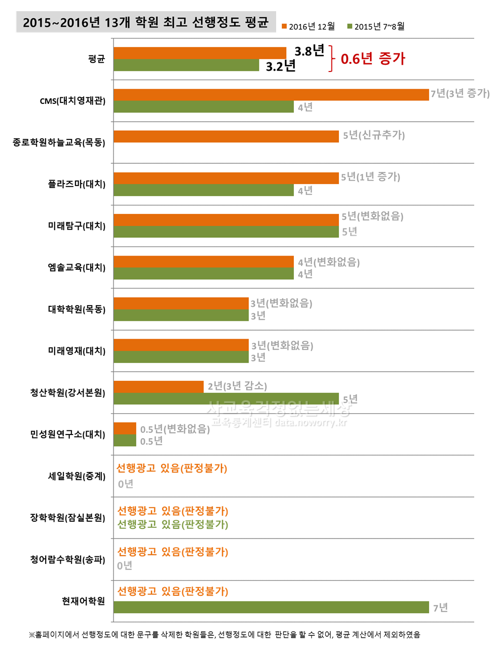2015년 조사 대비 이번 조사에서 13개 학원 중 최고 선행 정도가 증가한 곳은 2곳(CMS 대치영재관, 플라즈마학원 대치)이었습니다. 현재어학원 역시 표준교육과정에서 선행하는 것으로 확인되었으나 그 정도를 판단하지는 못했습니다. 작년에 선행 정도가 0년이었던 청어람수학원(송파)과 세일학원은 올해 선행교육 광고를 하고 있음을 확인했지만, 그 정도를 판단하지 못했습니다. 장학학원(잠실본원)은 작년과 동일하게 선행정도를 판정하지 못했습니다.